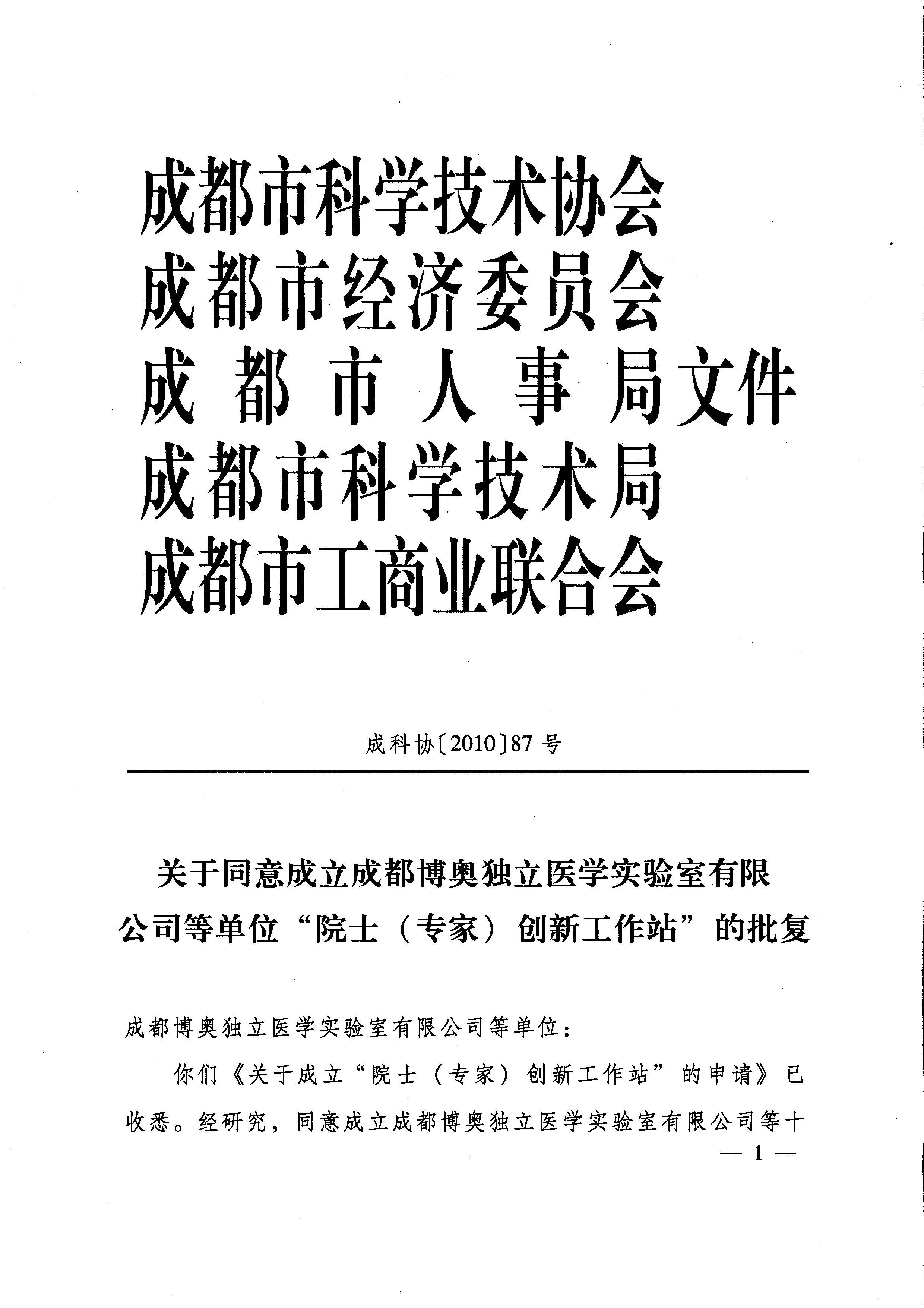 关于同意成立成都博身独立医学实验室有限公司等无机物“院士(专家)创新工作站”的批复