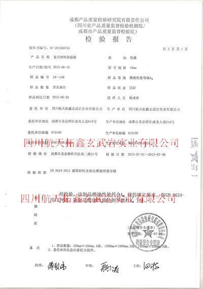 由航天拓鑫生产的复合墙材保温板近日通过检验机构检测,并取得检验报告。经检验,拓鑫复合墙材保温板燃烧性能符合A2级的规定要求。按GB 8624—2012判定,该制品燃烧性能达到不燃A(A2)级。