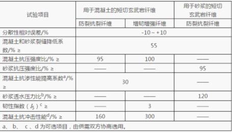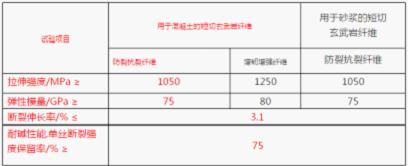 随着国家863计划“玄武岩纤维及其复合材料” 等课题的研发完成,《水泥混凝土和砂浆用玄武岩纤维》(GB/T 23265-2009)国家标准及《公路工程 玄武岩纤维及其制品 第1部分:玄武岩短切纤维》(JT/T 776.1-2010)交通部标准的实施,玄武岩纤维在水泥混凝土中的得到了全面的应用。短切玄武岩纤维的指标应满足上述标准的要求,具体见下表: