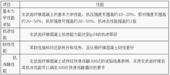 玄武岩纤维在强度上是钢纤维的3倍以上,耐酸碱腐蚀性强,能增加混凝土的基本力学性能(抗拉强度、抗冲击性能等),比重轻(与水泥混凝土的密度基本一致),施工方便,能使纤维均匀分散在混凝土中,形成三维乱向分布,提高混凝土的防渗抗裂能力。由于玄武岩纤维是柔性的,不会对轮胎产生不良影响,行车舒适性更好,噪音小。