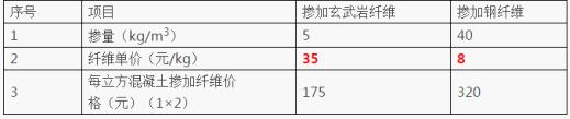 添加玄武岩纤维的水泥混凝土在性能上优于掺加钢纤维的水泥混凝土。在经济性上,掺加玄武岩纤维的价格更低。见下表所示: