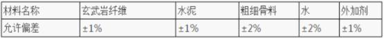 2.2 在施工期间,玄武岩纤维混凝土各种材料的质量,应按施工配合比和一次搅拌量计算确定。材料的称量偏差,不得超过表7.1.1的规定。