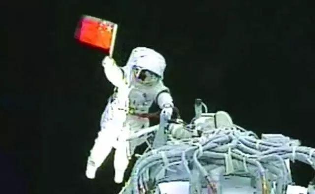 △航天员翟志刚圆满完成我国首次空间出舱活动,挥舞国旗。