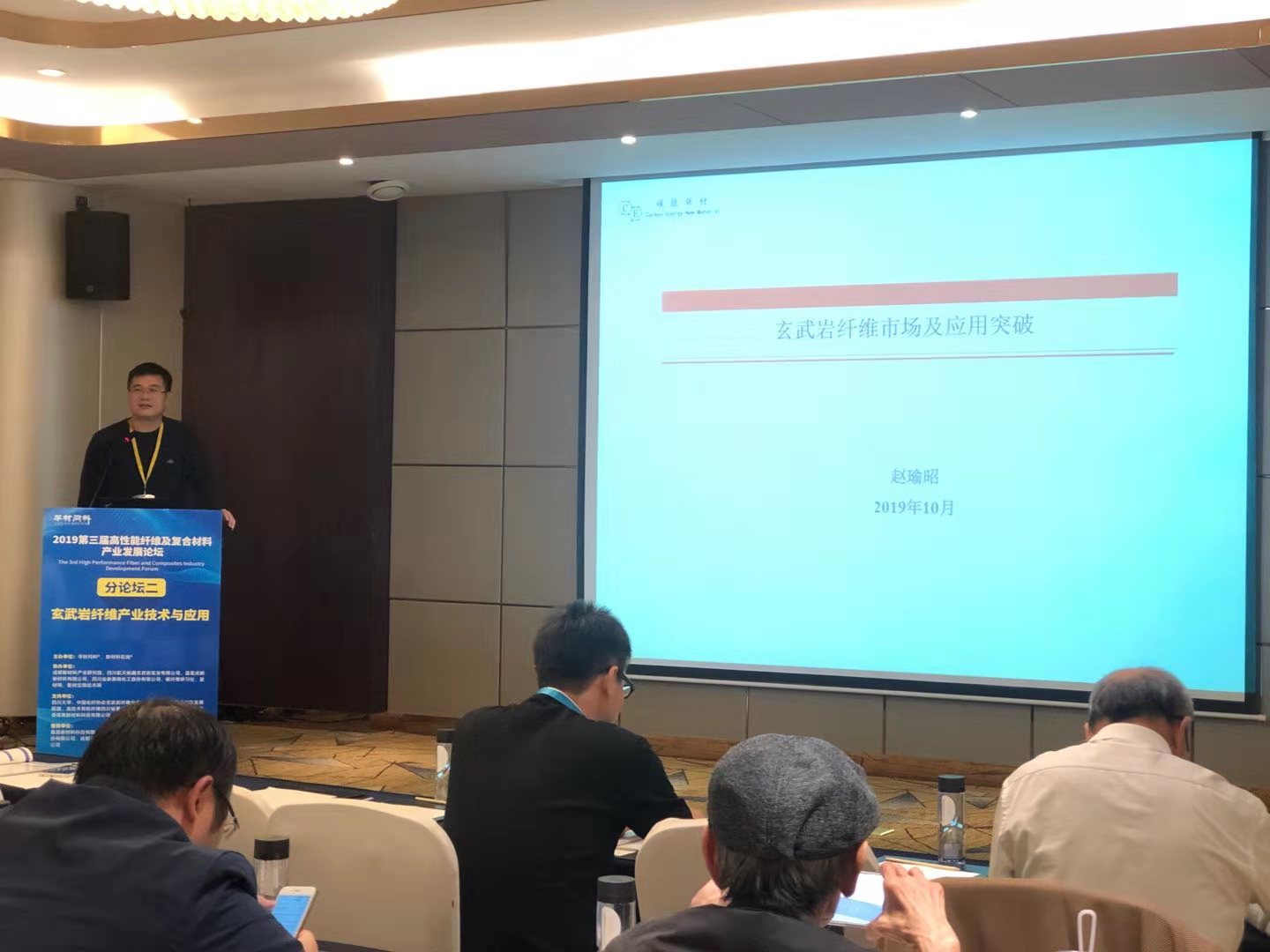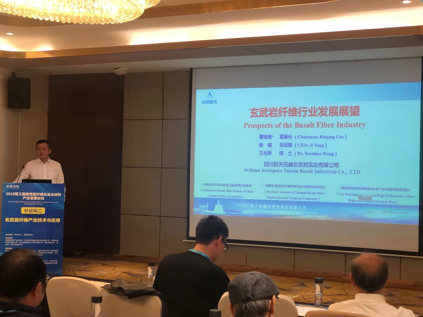 在玄武岩纤维产业技术与应用分会论坛上,西南交通大学土木工程学院副院长占玉林副教授作《玄武岩纤维在轨道交通中的应用和展望》报告、公司总经理杨骥作《玄武岩纤维行业发展展望》报告、上海航秦新材料有限责任公司董事长赵瑜昭作《高性能高品质玄武岩纤维复合材料的开发和应用》报告、四川煤田地质学局纤维用玄武岩研究所长徐小明总工程师作《纤维用玄武岩矿拉丝适宜性及资源潜力研究》报告 、四川省知识产权服务中心张俊逸专利分析师作《玄武岩纤维专利分析与产业布局构想》报告、四川省玄武岩纤维及制品质量监督检验中心质量负责人曹静高级工程师作《玄武岩纤维检测与标准化研究》报告。