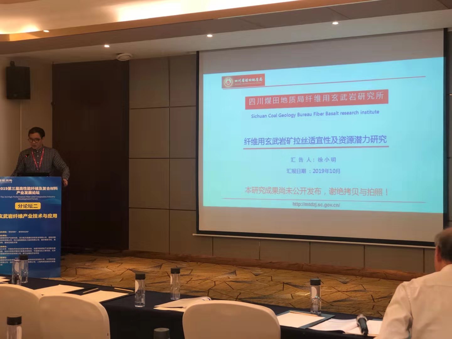 四川煤田地质学局纤维用玄武岩研究所长徐小明总工程师作《纤维用玄武岩矿拉丝适宜性及资源潜力研究》报告