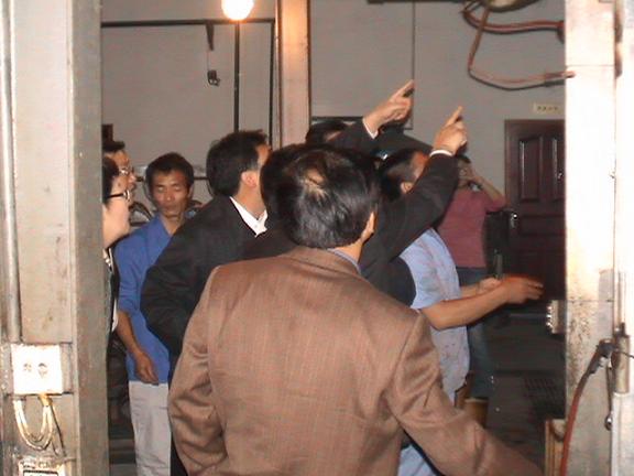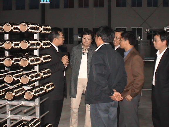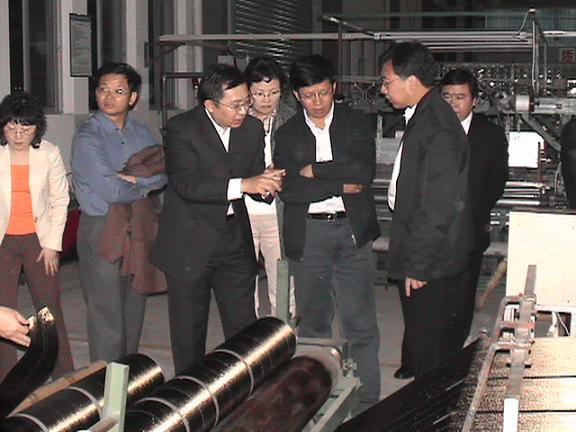 (公司总经理曹伯青为航天集团领导介绍单向布的生产工艺)