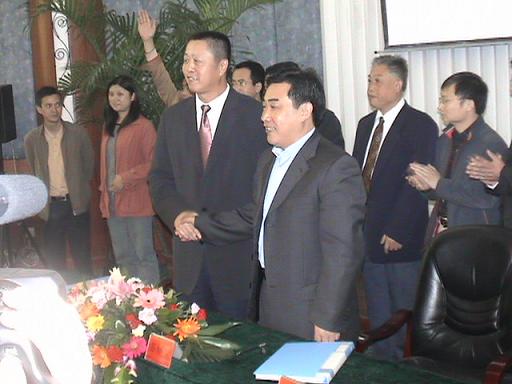 (图为签字结束后,张华和廖仁松握手留影)