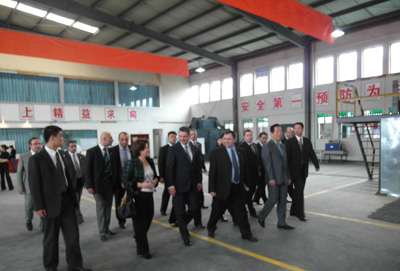 张华董事长、曹柏青总经理陪同亚美尼亚总理季格兰•萨尔基相政府代表团一行参观我公司生产车间