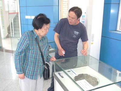 我公司副总经理鲜平(右)向中国化纤工业协会、中国纺织工程学会化纤专业高级顾问李瑞(左)介绍玄武岩纤维后制品市场用途
