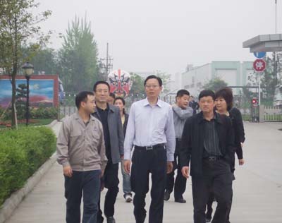 我公司副总经理杨彦斌(左一)陪同省经信委冶金建材处处长闫克俭(中)等领导一行参观公司厂房院区