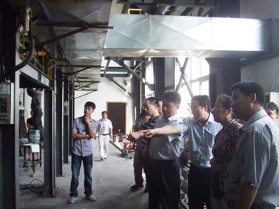 我公司副总经理鲜平(右二)陪同集团公司总工程师金其明女士(左二)、七院副院长王深坤(右一)参观拉丝生产车间