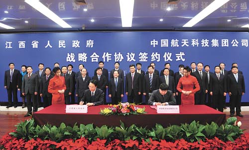 3月13日,江西省人民政府与中国航天科技集团公司在北京签署战略合作协议。协议的签署是双方深入贯彻落实科学发展观,加快转变经济发展方式和积极响应今年中央政府工作报告中提出的“坚持军民结合、寓军于民,走中国特色军民融合式发展路子”的重要举措。