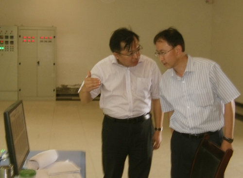 我公司总经理曹柏青(左一)陪同黄玉东院长(长江学者)右一参观车间