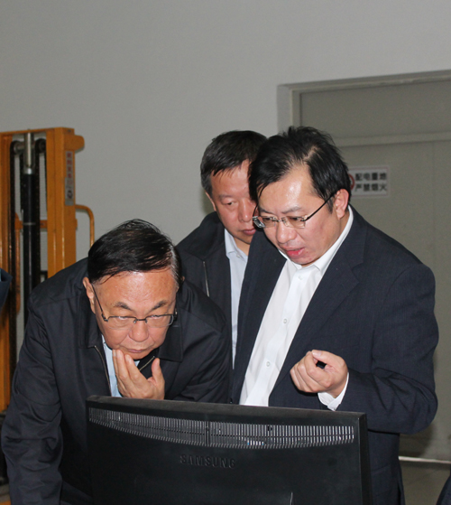 公司曹总(右一)陪同杜院士(左一)参观车间电控理化分析室