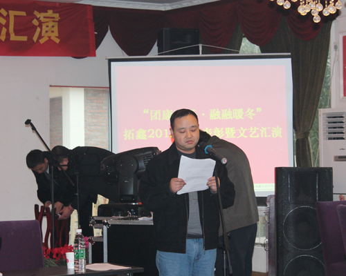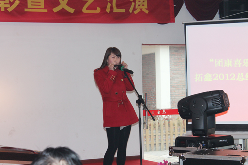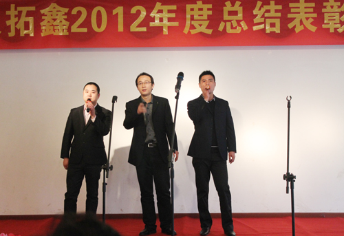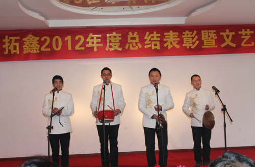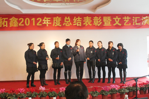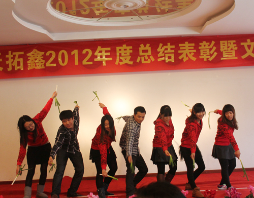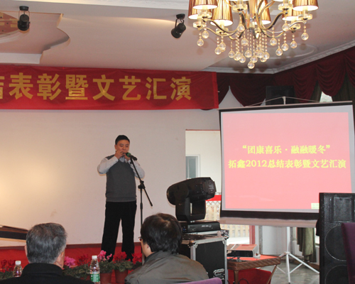 2012年公司文艺汇演在行政部的乐器串奏《新年好》中拉开帷幕。在随后的两个多小时中,在汇演主持人有序组织下,由乐器演奏、歌舞、小品、相声等环节组成的联欢节目高潮迭起,精彩纷呈。其中,由终身首席顾问张德富为大家带来的联唱《喀秋莎》、《莫斯科郊外的晚上》、《交城的山交城的水》为文艺汇演掀起了一个小高潮;市场部与生产部联合出演的方言相声《三句半》引起了全场阵阵欢笑与热烈的掌声;行政部演唱的《中国人》歌声气势磅礴、刚劲有力,引起了全场热烈的掌声;开发部舞蹈串烧,花样创新、喜气洋洋,引起了全场热烈的掌声;质管部手语表演《感恩的心》和生产部大合唱《常回家看看》寄语深刻,温情融融…… 精彩丰富的节目,激情给力的表演,使每位在场员工都感受到了拓鑫公司这个大家庭的温暖。
