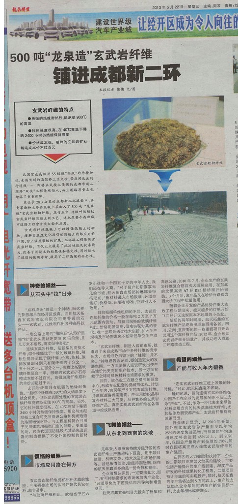 5月22日,龙泉开发报发表题为《500吨“龙泉造”玄武岩纤维铺进成都新二环》的新闻,标志着我公司玄武岩纤维制品正加快发展步伐,以其优越的产品性能、稳定的技术实力,正逐步替代传统材料。