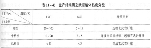 玄武岩的化学组成为SiO245%~53%,A12O312%~18%,CaO6%~10%,MgO5%~10%,Fe2O3+FeO9%~15%,Na2O+K2O3%~6%,TiO21%~3%。其中SiO2、Al2O3增加熔体的高温粘度,CaO、MgO、Fe2O3、FcO、Na2O、 K2O降低熔体的高温粘度。因此,不同化学组成的玄武岩就具有不同的高温粘度,不同的熔制温度和成型温度。熔制试验结果表明,玄武岩熔体的纤维成型温度范围为1300~1450℃。针对不同形态纤维成型工艺的特点,将玄武岩熔体按粘度大小分为:适于连续纤维成型的粘性熔体、适于连续纤维和超细纤维成型的中粘度熔体和适于定长纤维成型的低粘性熔体。其相应的成型粘度范围见表11-45。