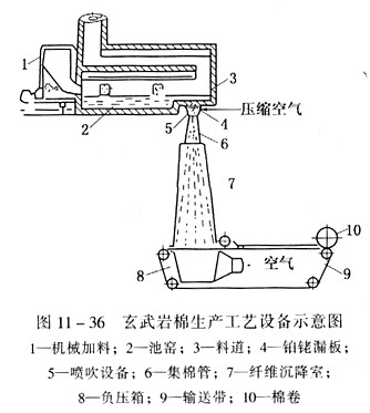 普通玄武岩棉通常采用空气立吹法工艺进行征税。图11-36是空气立吹法生产玄武岩棉的工艺设备示意图。如图所示,经破碎、清洗后直径为50mm的玄武岩料块,由加料设备投入池窑,在1450~1500℃温度下熔化,均化,脱气后,熔体流入流液槽,进入装在流液槽底部的铂铑漏板,漏板有10个漏嘴,漏嘴直径为(3±0.2)mm,通过漏嘴流出的熔体形成一定直径的流股,流股被喷吹设备的高速压缩气流分散并牵伸成纤维,降落在沉降室的输送带上,输送带下面抽真空,使沉降室形成负压。随着输送带的运动,收卷成一定直径的棉卷。玄武岩棉以卷材形式供货,在0.5g/cm2载荷下容重为40kg/m3,纤维平均直径为10~141μm。也有将棉直接沉降在多孔的滚筒上,滚筒里面抽真空。
