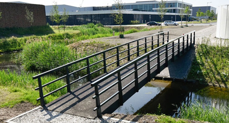 荷兰代尔夫特理工大学、荷兰FiberCore Europe公司和史基浦物流园合作建成了该生物基桥梁。他们克服了一些技术限制,因为生物基玄武岩纤维复合材料以前从未在桥梁建筑中使用过。